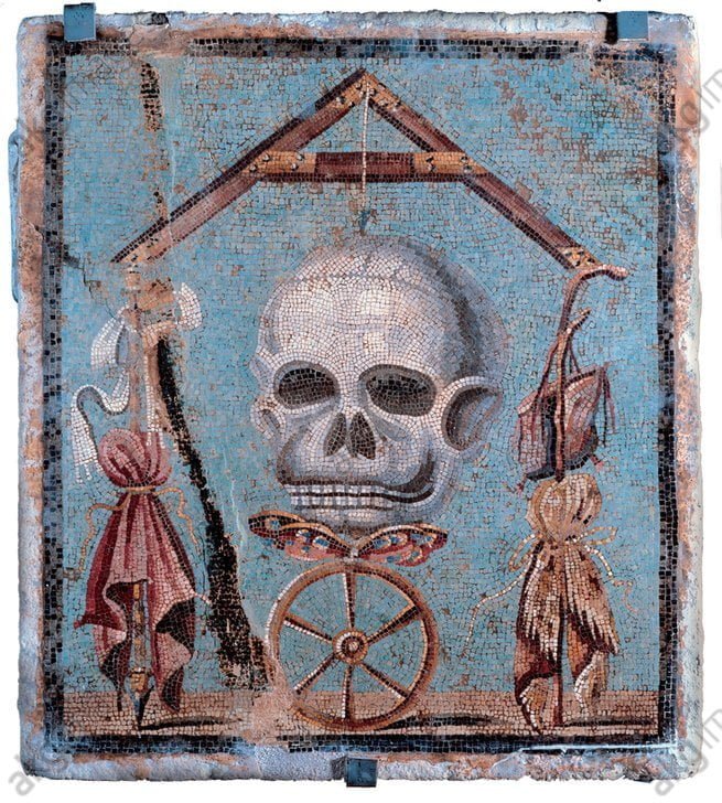 A skull alone is a classical memento mori—a reminder of mortality and the fleeting nature of life. This symbol has deep historical roots, appearing not only in Renaissance and Baroque painting but even earlier in Roman culture. Floor mosaics and wall paintings uncovered in Pompeii, for instance, include depictions of skulls as reminders of the inevitability of death—often positioned beneath symbols of power to emphasise life’s equalising force.